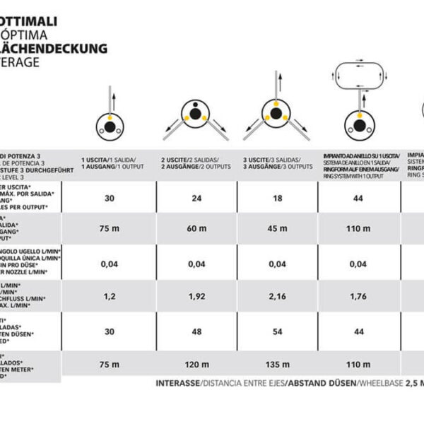 I tre ugelli a nebulizzazione ultra-fine permettono di avere una distribuzione del prodotto omogenea a 360°, per una maggiore efficacia dei trattamenti. Le guarnizioni speciali in FPM lo rendono idoneo anche all’utilizzo dei prodotti più aggressivi. L’innovativo ugello interno permette la miscelazione ottimale di qualsiasi prodotto utilizzato.