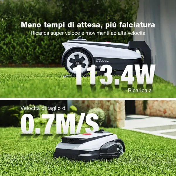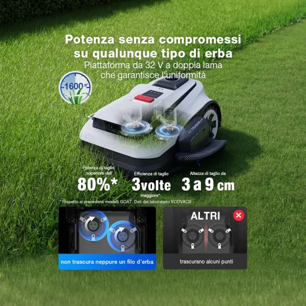 *Dati del laboratorio ECOVACS. ECOVACS GOAT può tagliare fino al bordo lasciando 0 cm di erba. L’efficienza delle prestazioni si basa su test condotti su scenari erbosi reali in laboratorio e può variare a seconda delle diverse condizioni di utilizzo effettive. *Dati del laboratorio ECOVACS. ECOVACS GOAT può falciare 400 metri quadrati all’ora. L’efficienza delle prestazioni si basa su test condotti su scenari erbosi reali in laboratorio e può variare a seconda delle diverse condizioni di utilizzo effettive. *La “”velocità di rotazione più rapida del 33%”” si riferisce esclusivamente a un confronto con tutti i precedenti modelli GOAT di ECOVACS, in base ai dati del laboratorio ECOVACS. In base ai test eseguiti nell’ambiente di laboratorio ECOVACS, la Serie GOAT A offre una velocità di rotazione di 3000 giri/min, che corrisponde a un aumento del 33% rispetto ai 2250 giri/min di GOAT G1. I risultati reali possono variare a seconda di fattori quali il tipo di erba, le dimensioni del prato, il terreno e altre condizioni ambientali.