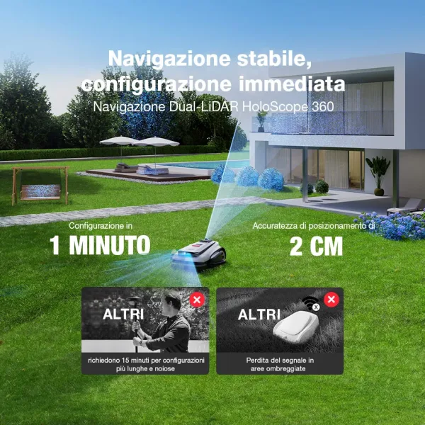 Configurazione automatica con un solo tocco: HoloScope 360 avvia GOAT in un minuto. Questo innovativo sistema di navigazione Dual-LiDAR utilizza un LiDAR rotante a 360°, un LiDAR 3D-ToF e una telecamera IA, crea automaticamente una mappa olografica altamente dettagliata e garantisce una navigazione con precisione di 2 cm su tutto il prato, anche al buio.