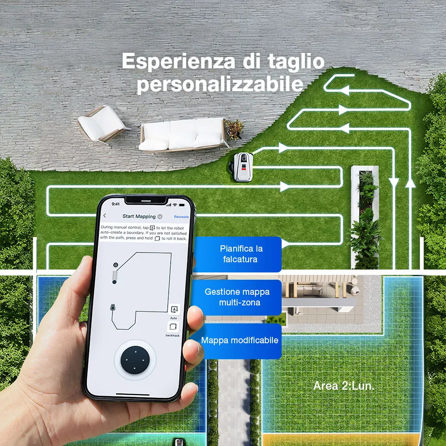 La modifica della mappa intuitiva consente agli utenti di aggiungere, unire, dividere e cancellare le aree in base alle proprie preferenze. Inoltre, è possibile programmare la frequenza di falciatura per aree specifiche in base alle preferenze e pianificazioni personali.