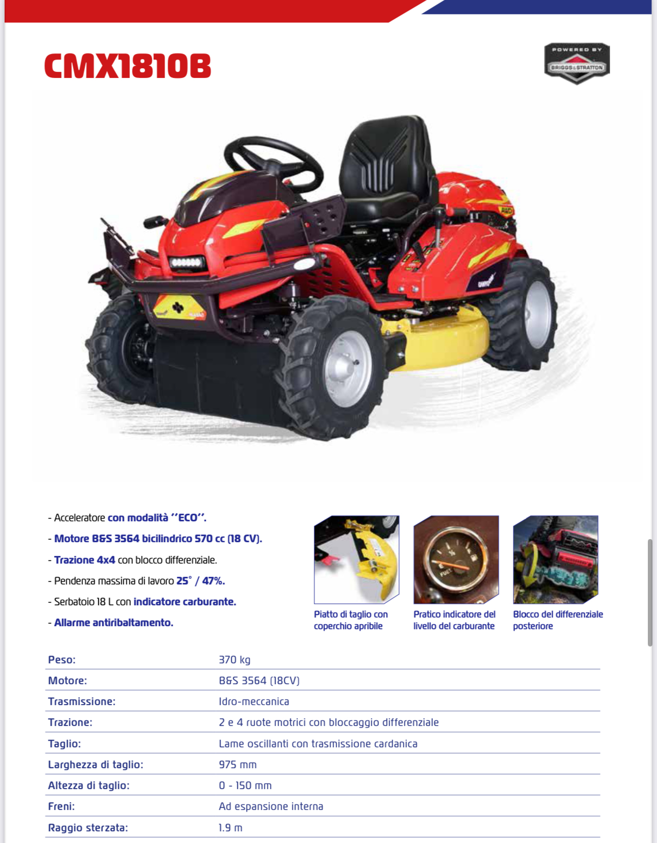 – Motore B&S 3564 bicilindrico 570 cc (18 CV). – Trazione 4×4 con blocco differenziale.